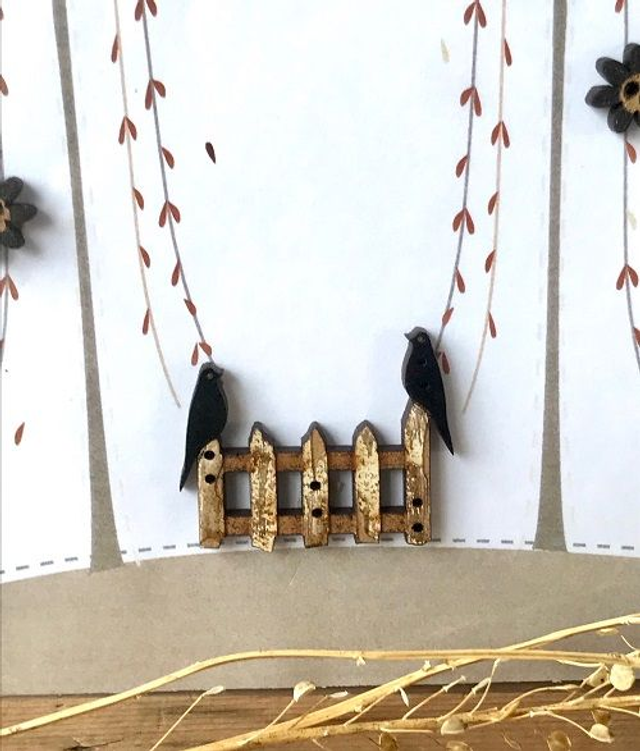 sachet de boutons décoratifs en bois peint et son petit dessin à utiliser comme un modèle à broder : 1 barrière et corbeaux peints , 4 mini fleurs